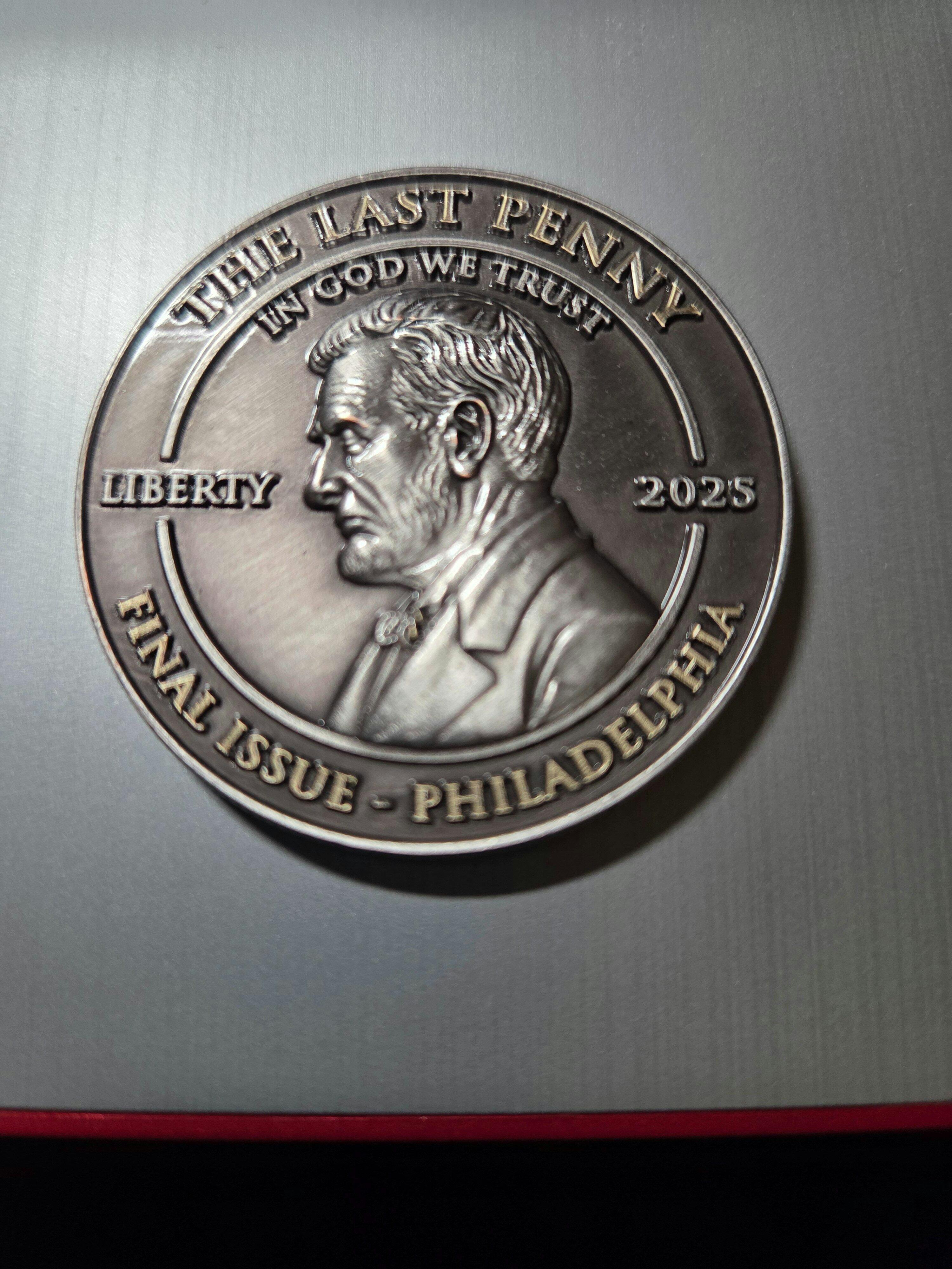 On November 12, 2025 the U.S. mint stamped the last penny for production in the United States. This coin acts as a tribute to the last cent. The front of the coin features a copper plated penny design (not a real penny) on top of a marked gravestone with commemorative text "The Final Cent Tribute" and "1793-2025 Commemorative Edition" The back of the coin has a raised bust of Lincoln frowning with text "The Last Penny" and "Final Issue - Philadelphia"