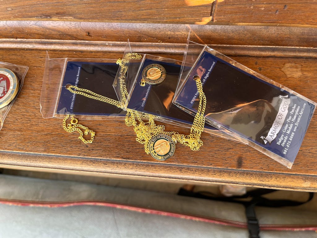 The back of the Challenge Coin also features images of the elements of armor along with specific phrases from the verses in Ephesians where Paul also advises us to stand with, “Loins: Girt with Truth”, “Breastplate: of Righteousness”, “Feet: Gospel of Peace”, Shield: of Faith”, “Helmet: of Salvation”, and “Sword: of the Spirit”.